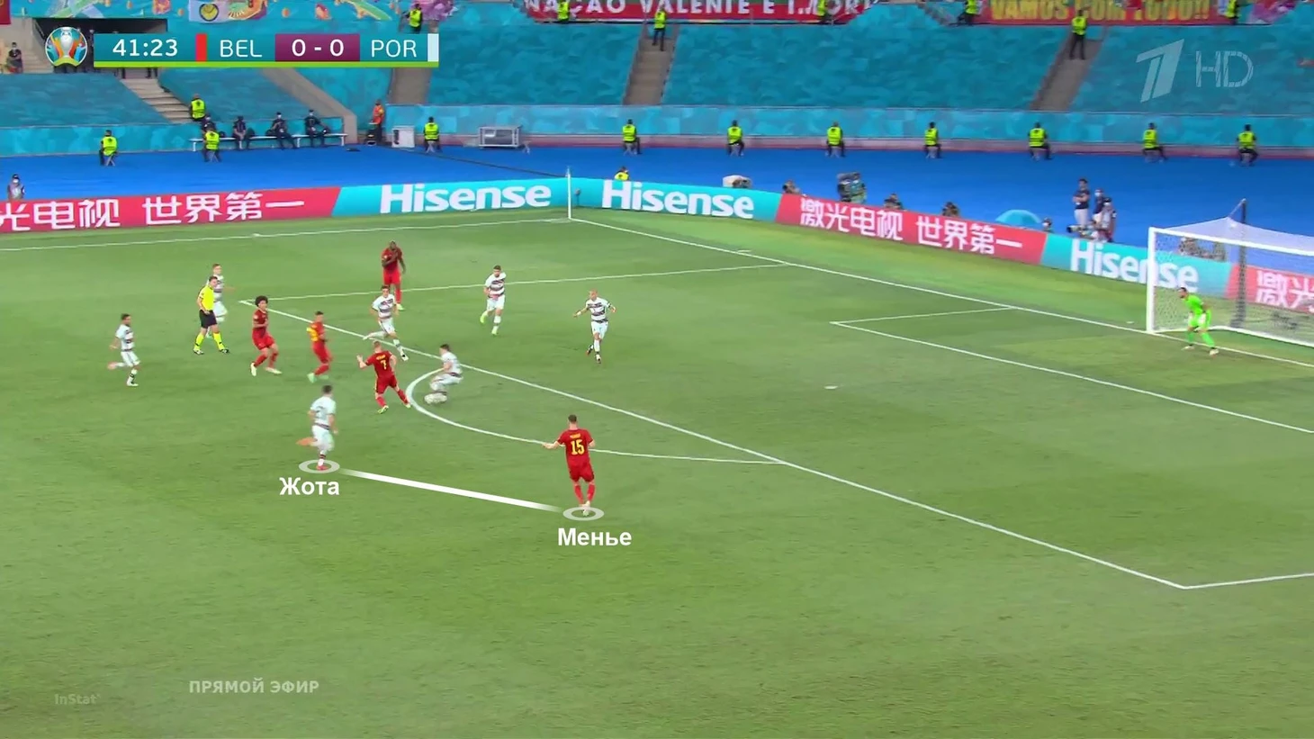 На другом краю Жота добежал, чтобы отбиваться против Менье, а Торган Азар остался свободным (португальцы не разобрались, кто вместо Бернарду выдвигается):