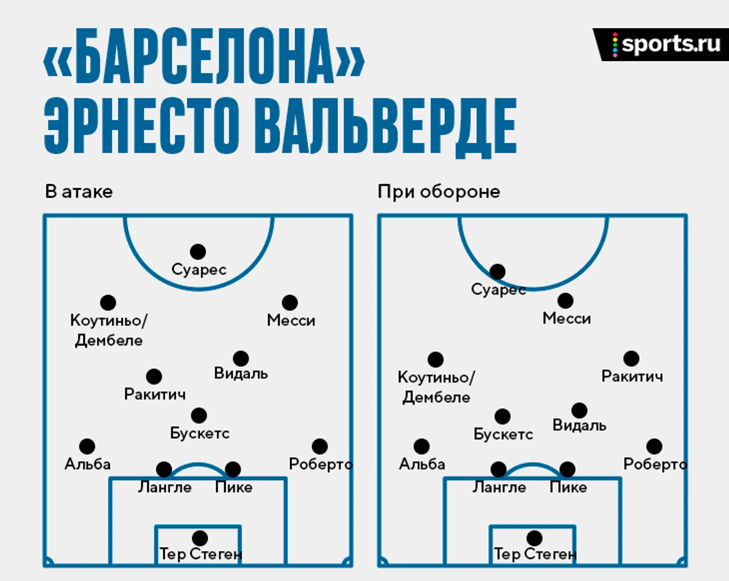• Месси предпочитал 4-4-2 – схему, которую тогда наигрывал в «Барселоне» Вальверде. Лео объяснил, что при владении мячом в 3-5-2 правый латераль и правый центральный полузащитник будут отнимать у него пространство. Месси предложил использовать на одного центрального полузащитника меньше, чтобы у него оставалась свобода для отхода вглубь за мячом.