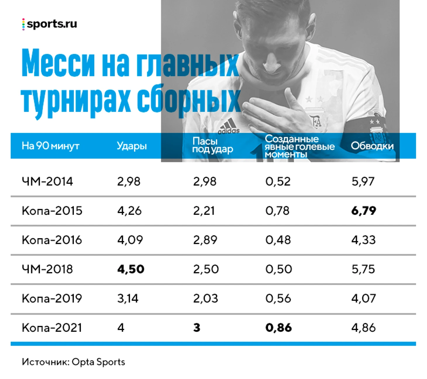 Статистика лишь подтверждает впечатления: на всех этапах, кроме финала, Лео был прекрасен. В четырех из семи игр Аргентины его официально признавали лучшим игроком матча.