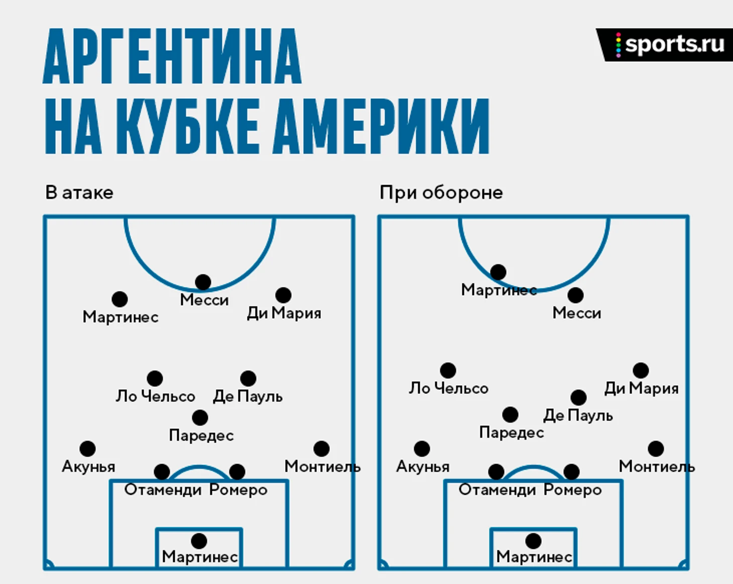Аргентина при Скалони делает примерно то же самое – только фланг трансформации другой. Ло Чельсо становится левым полузащитником, а из атакующей тройки на правый фланг отходит трудяга Анхель Ди Мария: