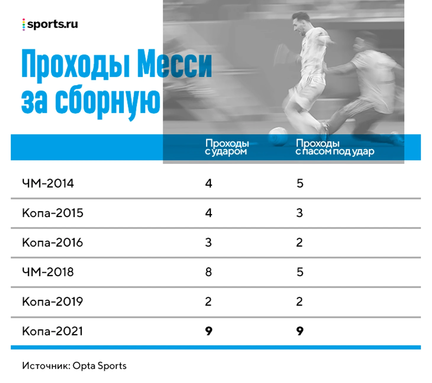 Здесь прямая связь с удобством в момент получения. Отдельно надо выделить проходы с пасом под удар – с отрывом лучший показатель. Никогда раньше у Лео не было столько вариантов после стартового рывка с мячом.