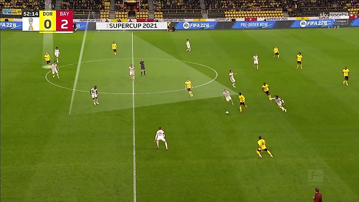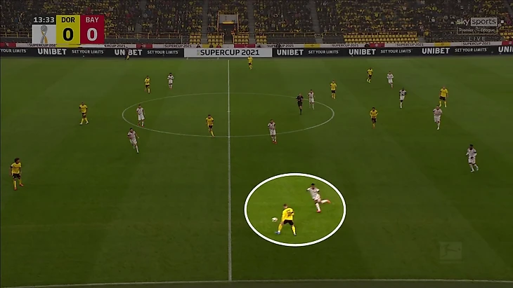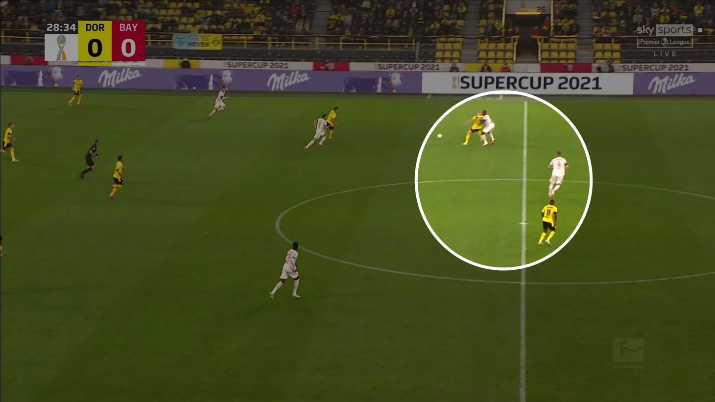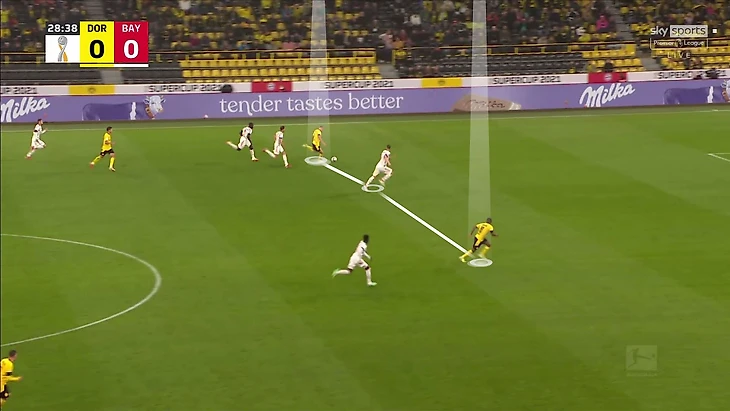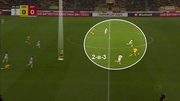 Пара скоростных нападающих против тройки игроков «Баварии» плюс набегающие из глубины полузащитники «Боруссии». Иногда удавалось создать и 2-в-2 на пространстве: