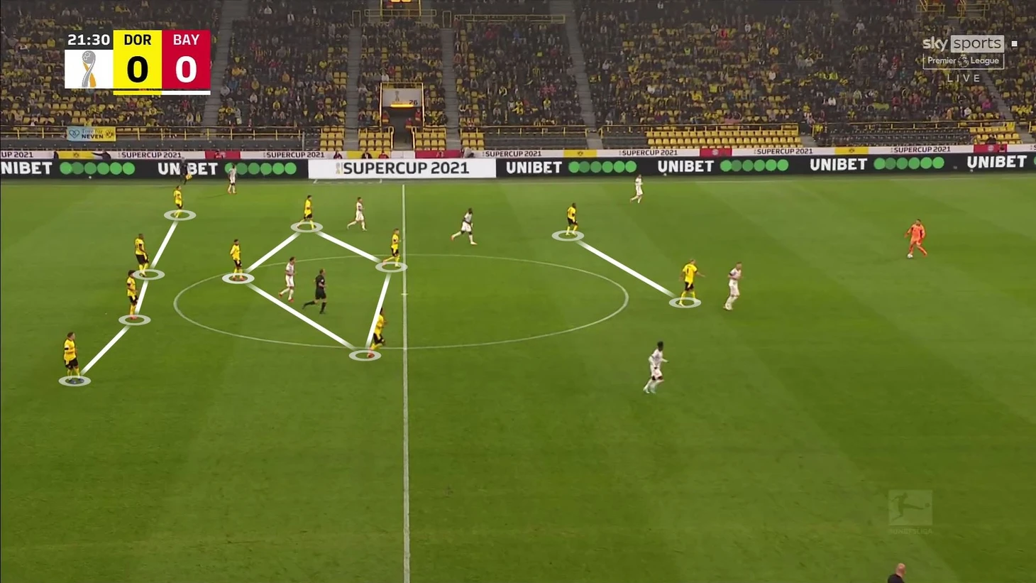 «Боруссия» получила следующие преимущества: не позволяли «Баварии» доминировать в центре (4-в-3 – количественное соотношение в пользу «Дортмунда»), схема помогала очень интенсивно прессинговать в зоне мяча, при быстрых атаках возникала потенциальная ситуации 2-в-2 (пара нападающих против центральных защитников «Баварии»).