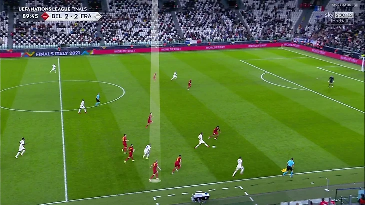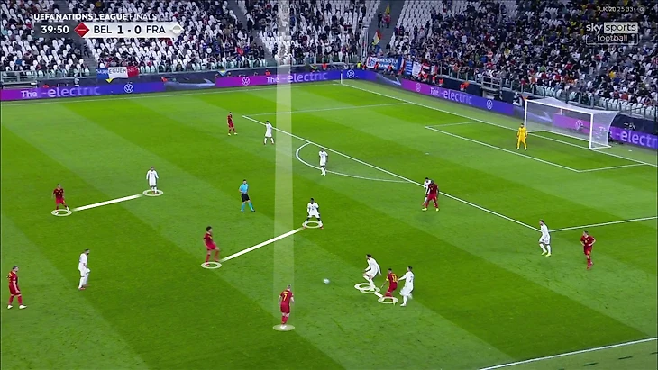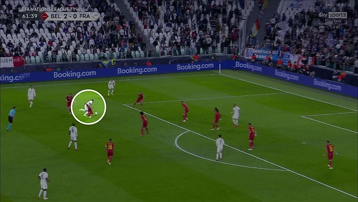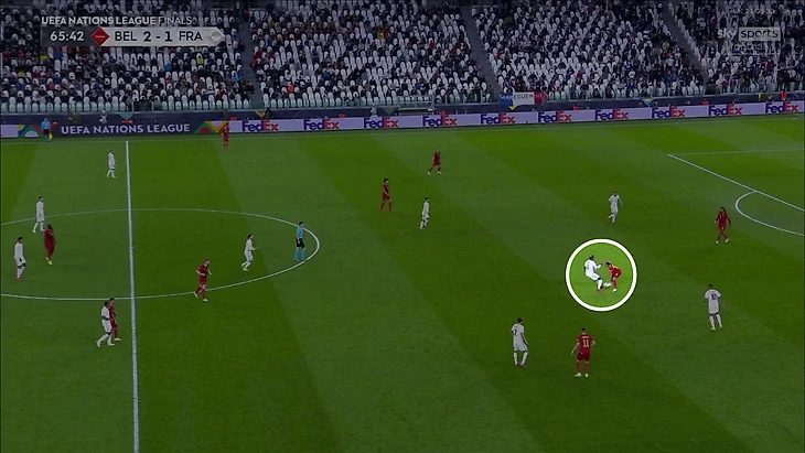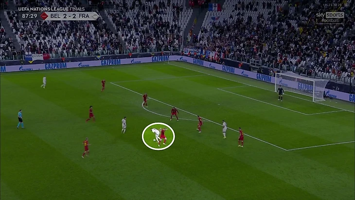 Атака Франции на победный гол пошла в финальную стадию после неудачной попытки Кевина замкнуть соперника на фланге, сам КДБ выключится из эпизода: