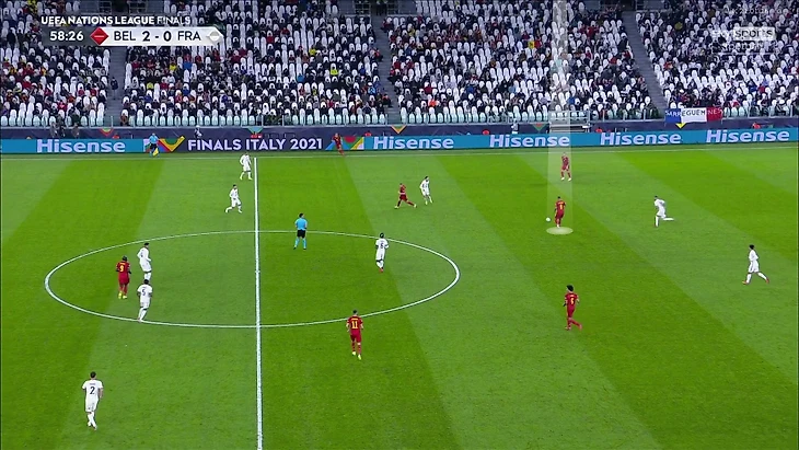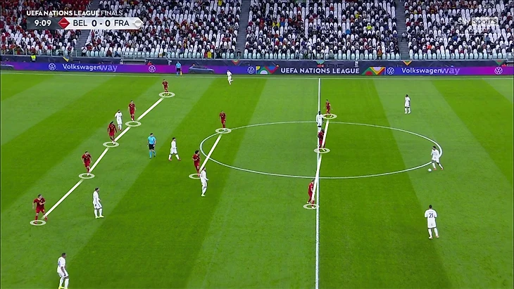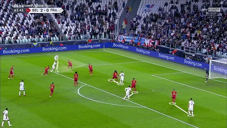 Конечно, самые страшные ситуации возникали, когда свободными оказывались атакующие игроки – КДБ или Азар. Проблема проявилась во втором голе. Вот ситуация за несколько секунд до голевого паса Де Брюйне – тройка полузащитников Франции против трех полузащитников Бельгии, а оставшийся КДБ свободен:
