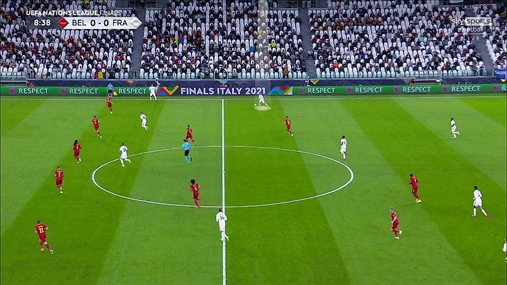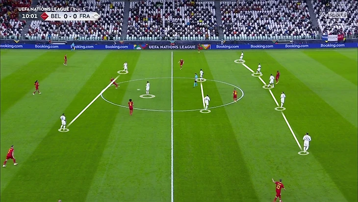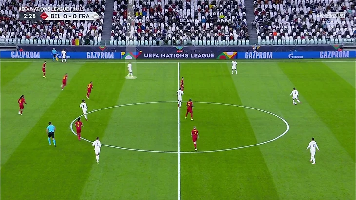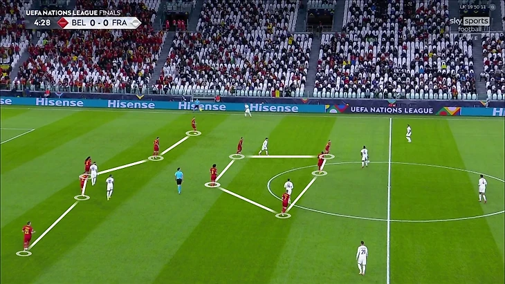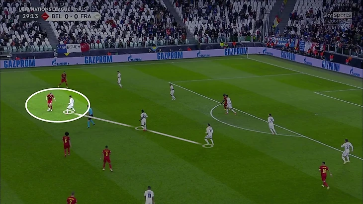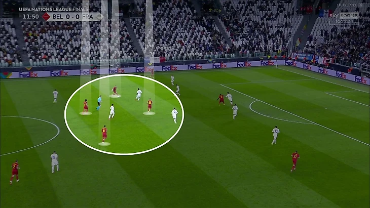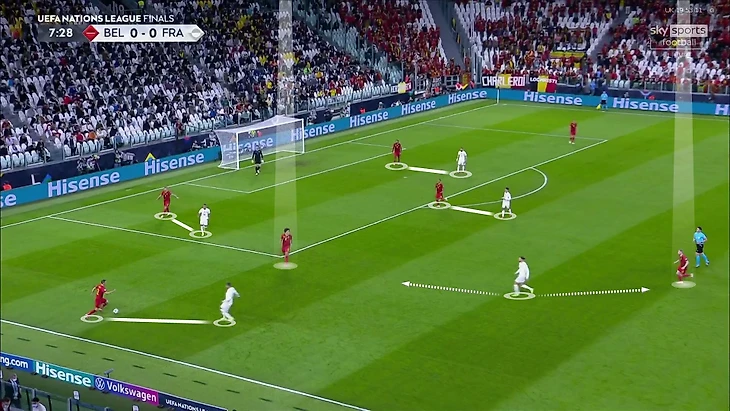 7. Частой была ситуация 4-в-3 в центральной зоне – Витцель, Тилеманс, Де Брюйне и Азар со стороны Бельгии против Погба, Рабьо и Гризманна у Франции. Кто-то из бельгийцев всегда получал свободу, а Франция не мешала им атаковать именно через эту зону: