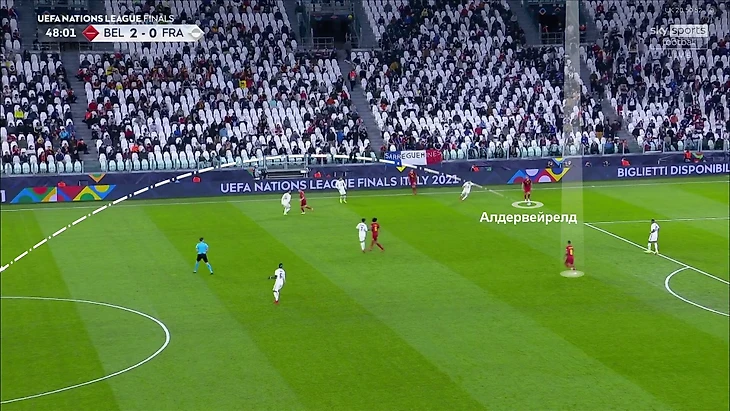 Это привело к интересному эффекту – огромное количество ошибок бельгийцев, хотя свободный вариант по-прежнему был. Например, тут перед Алдервейрелдом абсолютно свободный Тилеманс и вариант с простым пасом на него – вместо этого попробует дальний пас с левой: