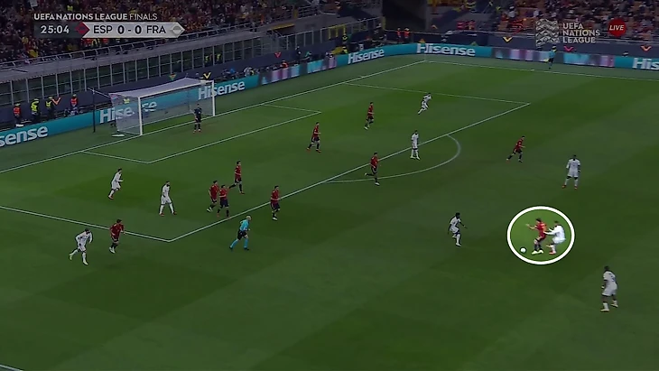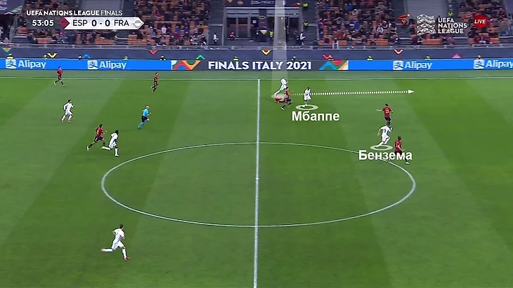 Основные моменты Франции пришлись на скоростные атаки, где важную роль играли два элемента – оперативный перевод с одного фланга на другой под прессингом и насыщение этого дальнего фланга.