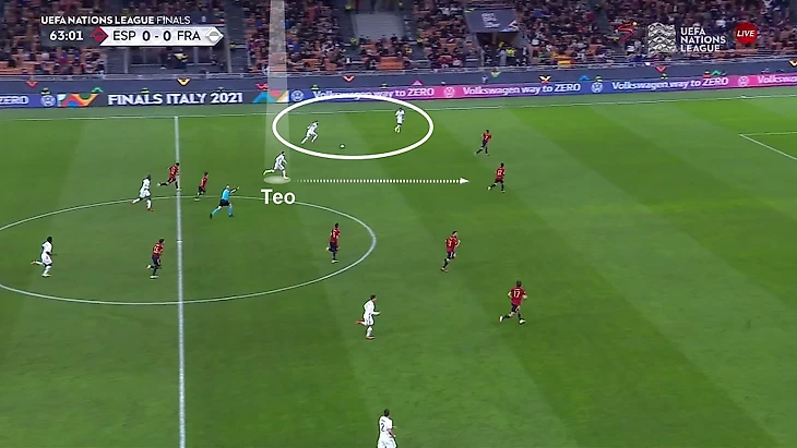 Чтобы добраться до этой зоны Франции, часто приходилось демонстрировать индивидуальные фокусы, но выбор зоны и расположение в ней были не случайными. Бензема понимал, что центральный защитник не пойдет за ним так далеко и таким образом получал свободу. Невероятно резкий Тео со своими рывками служил идеальным союзником для Карима и Килиана. Вскрывать эту зону было особенно удобно.