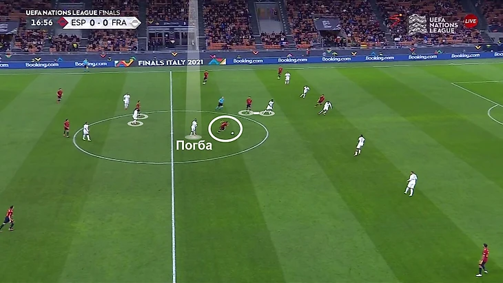 Потенциальным источником открытости в центральной зоне могли быть недоработки Поля Погба при персоналках. Он прекрасен с мячом, но без него действительно иногда выключается. Изначально его оппонентом был Гави. Полузащитник «Барсы» несколько раз здорово отрывался от Поля в стартовые минуты, но потом Дешам попросил Тчуамени и Погба поменяться местами. Теперь Погба действовал против Родри: