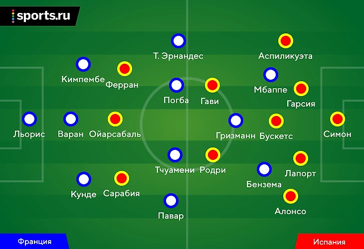 Дидье Дешам продолжил эксперименты с игрой в три центральных защитника. Луис Энрике выбрал классику – 4-3-3, но внутри было два крайне важных решения. На позиции нападающего вышел Микель Ойарсабаль (в роли ложной девятки – не новый прием, но он значительно меняет игру Испании), а в центре полузащиты вместе появились Родри и Серджи Бускетс (редкий и крайне осторожный выбор).