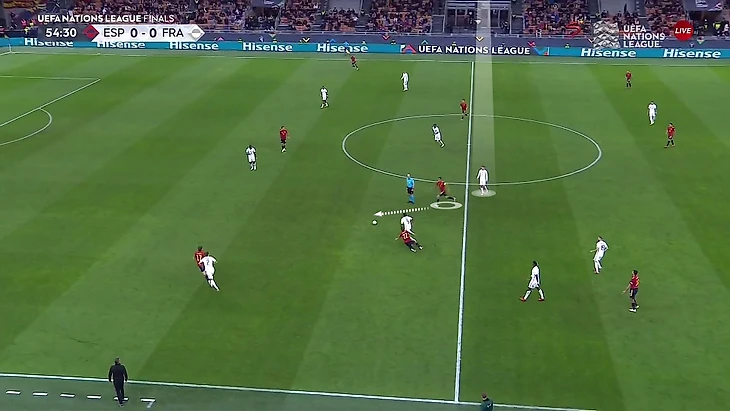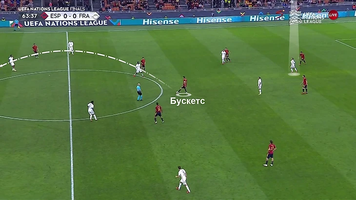 Потенциально это открывало игру в обе стороны. У Испании разблокировался привычный вариант построения атак, а у Франции, чуть что, был дополнительный игрок в контратаках. Первыми ситуацию в свою пользу использовали испанцы. В первом голе абсолютно свободный Бускетс нашел дальним пасом Ойарсабаля: