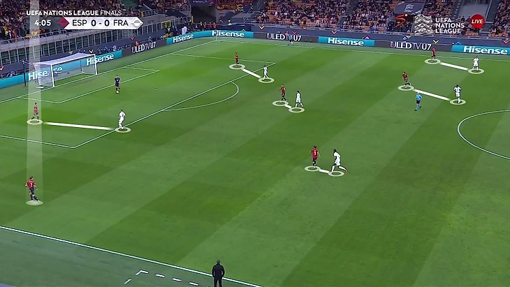 Схема Дешама 3-4-1-2 зеркально накладывается на формацию Испании 4-3-3. В таком сценарии уместным был персональный прессинг. Именно так Франция строила игру без мяча. В центре каждый играл с каждым: