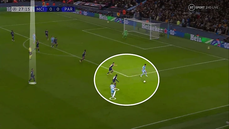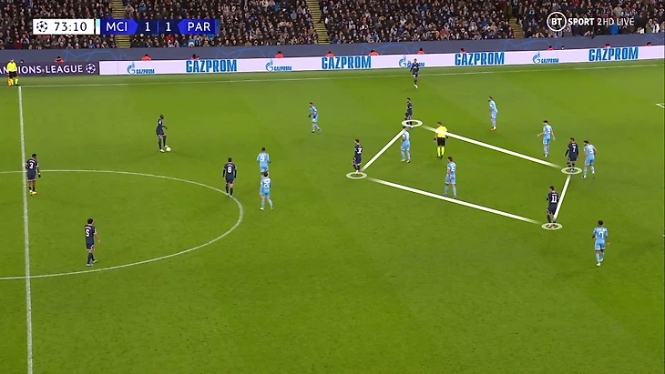 Получив такой перевес, «Сити» регулярно вскрывал недостатки схемы «ПСЖ». Расположение команды Почеттино при обороне выглядело примерно так: