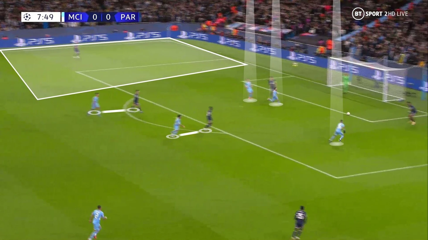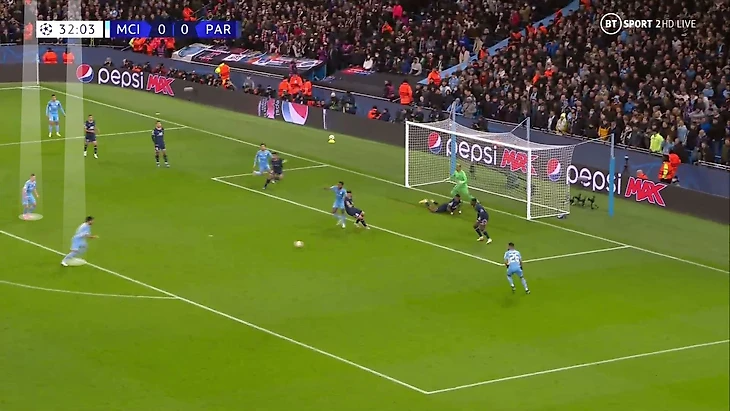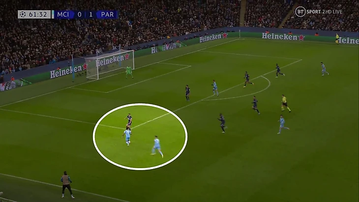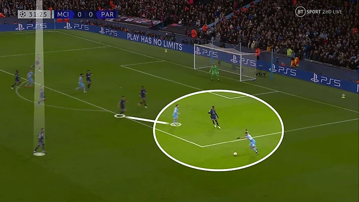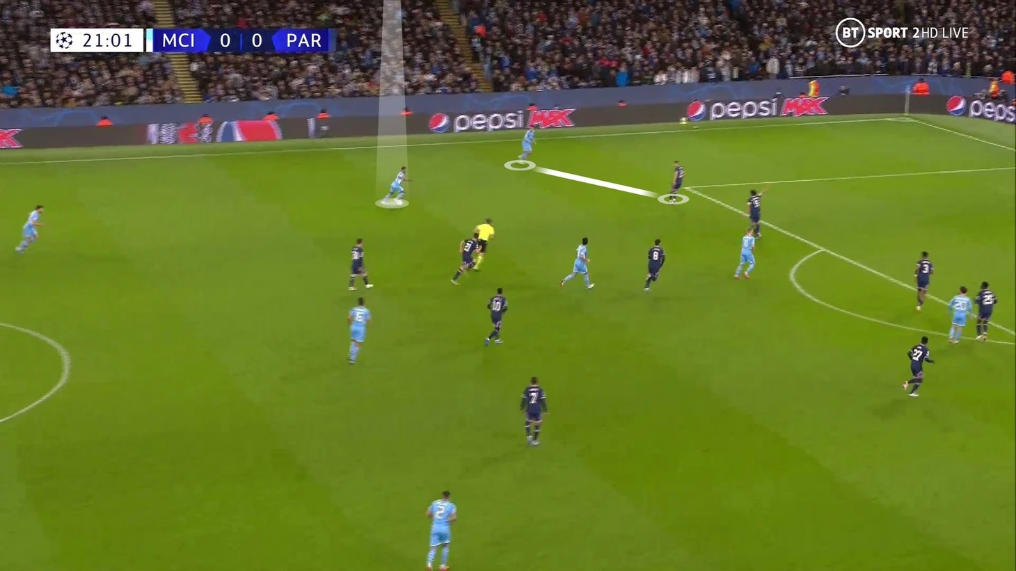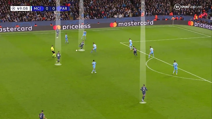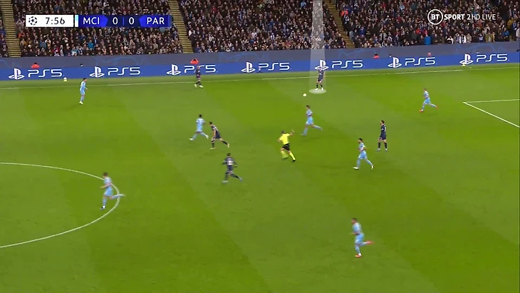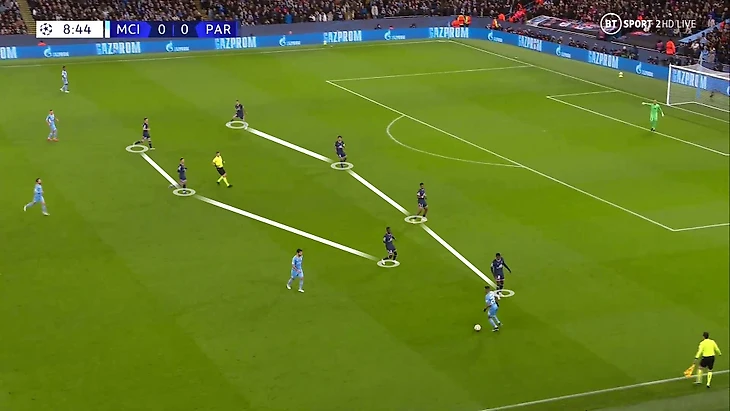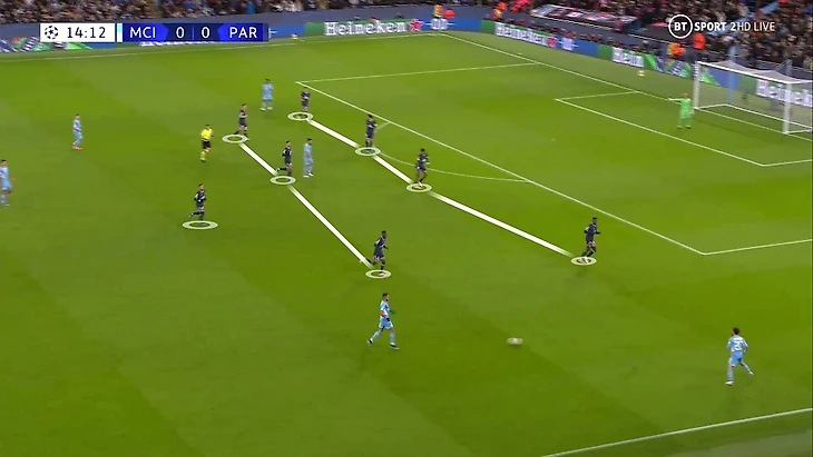 Лишь в совсем затяжных позиционных атаках соперника «ПСЖ» принимал более строгую схему, где защищены фланги. Но, как правило, «Сити» хватало времени на проникновение в острые зоны.