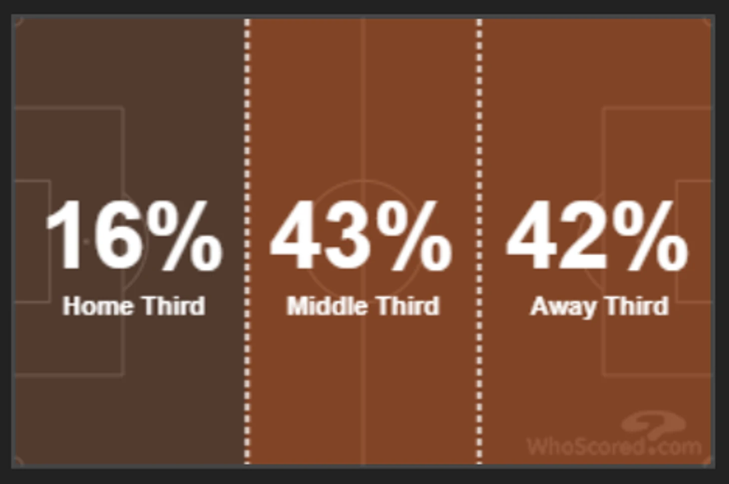 Проблема усугубляется тем, насколько продолжительные отрезки приходится «ПСЖ» проводить в обороне в топ-матчах. Без прессинга команда не может отвоевать территорию. Мы получаем просто дикие соотношения по игре на своей и чужой трети поля. Так выглядит карта вчерашнего матча: