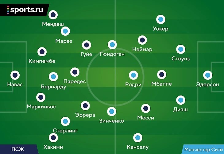 Навас, Мендеш, Кимпембе, Маркиньос, Хакими, Гуйе, Паредес, Эррера, Неймар, Мбаппе, Месси