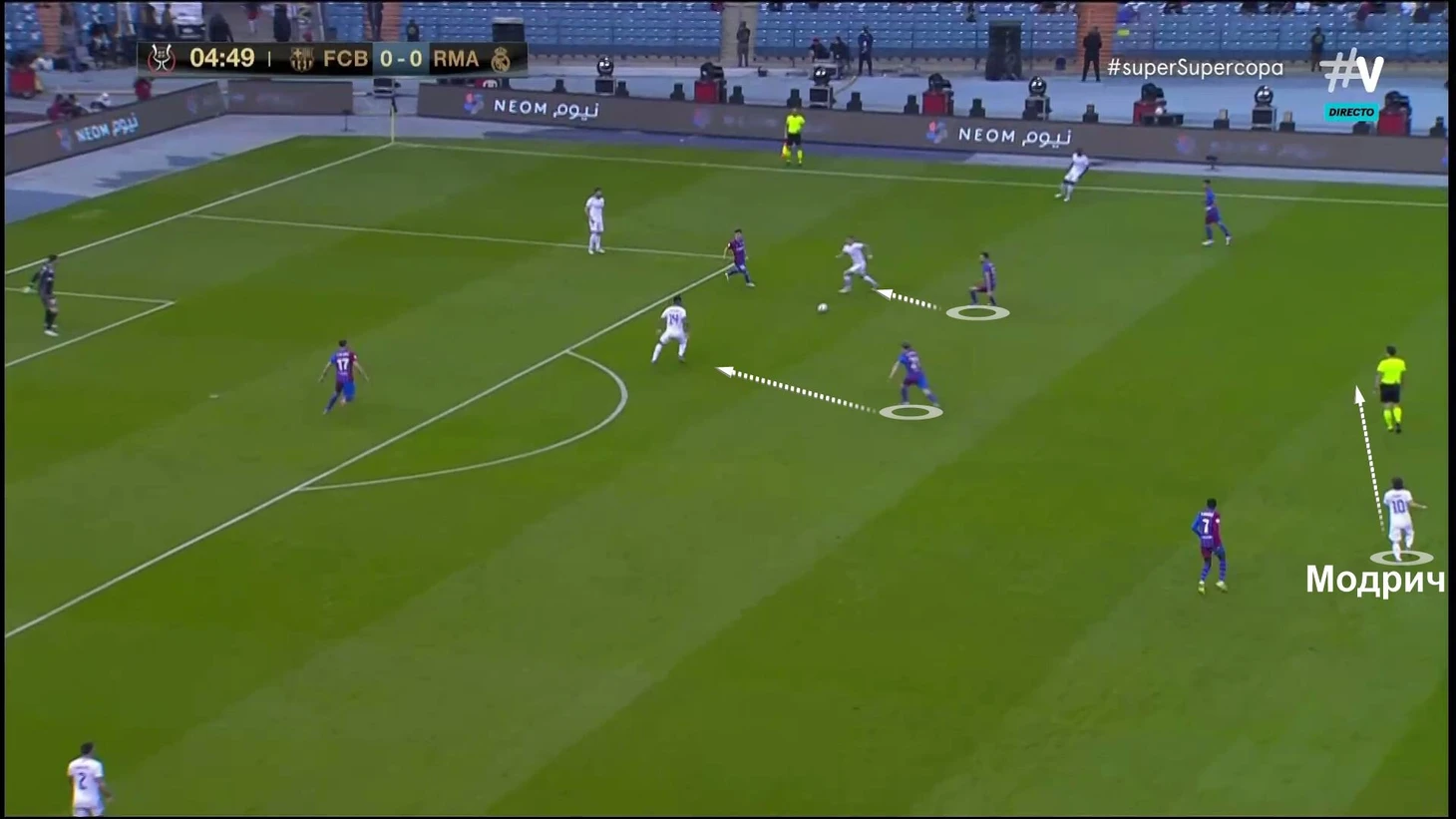Все они выбрасываются, но не отбирают мяч – Модрич разбил цельность барселонской защиты, а затем развернул атаку на свободный фланг: