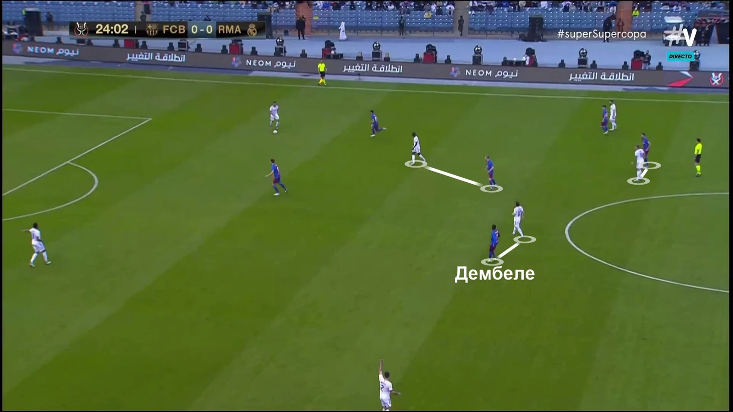 Та же структура, но «Мадрид» не получал преимущества в центре, хотя пытался активно запутывать (Менди ушел в опорную, Каземиро в центре защиты). Дембеле поддерживает компактность, играет по Модричу и компенсирует нехватку игрока в этой зоне: