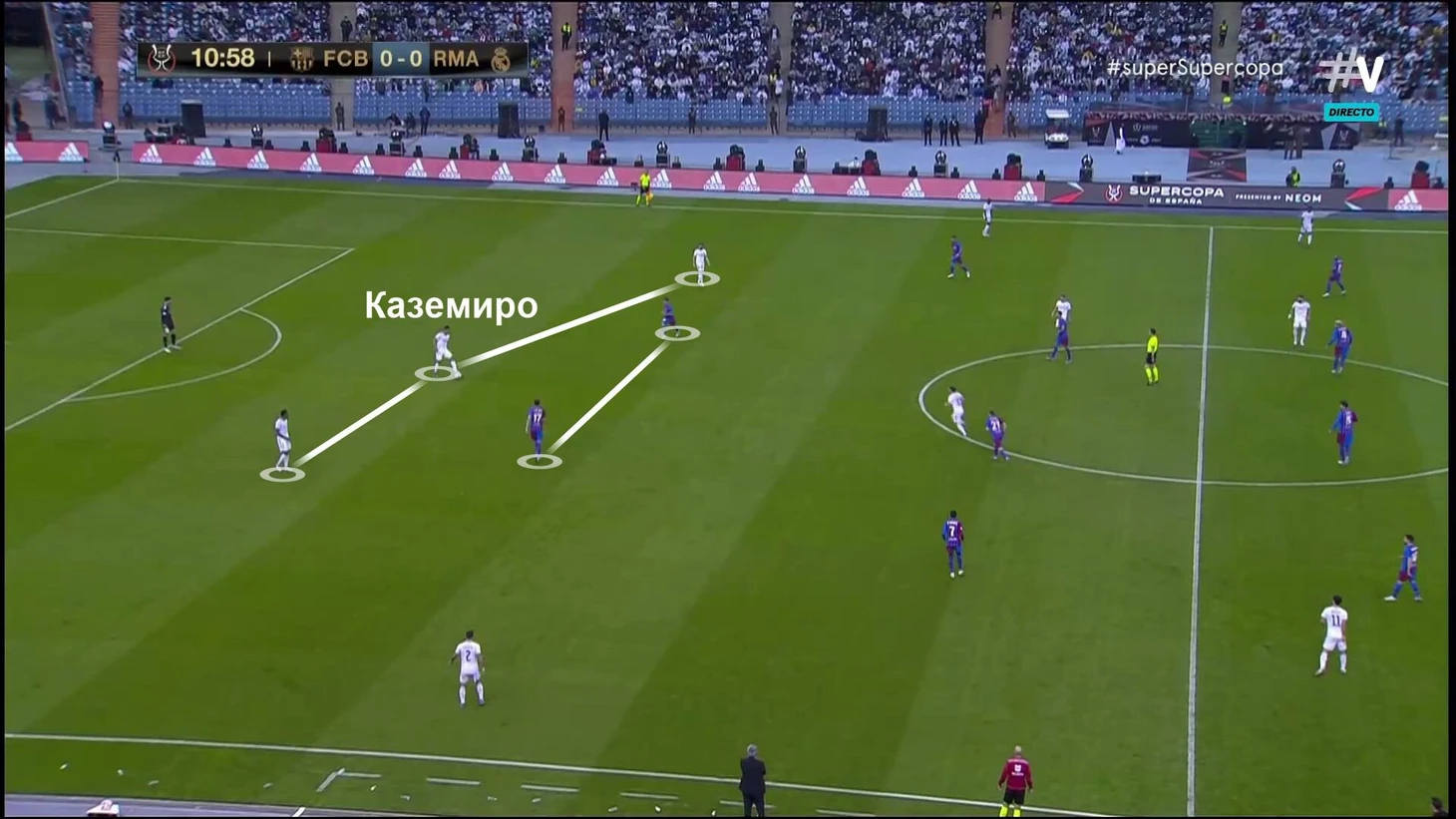 Второй вариант преимущества – 3-в-2 в первой стадии. Каземиро опускается к центральным защитникам – Гави и Люку Де Йонгу приходится разрываться, а один из защитников все равно свободен: