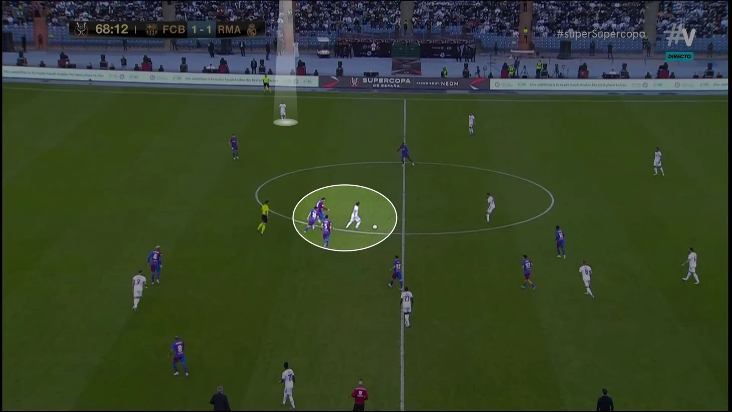 После перевода Усман успевает сместиться и оказать давление на Карвахаля. Через пару секунд «Барса» вернет себе мяч: