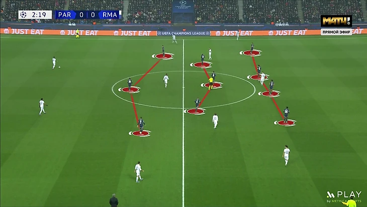5. У «ПСЖ» есть похожая проблема – далеко не весь состав готов прессинговать. Но решения хозяев были более креативными. В качестве базиса использовалась схема 4-3-3: