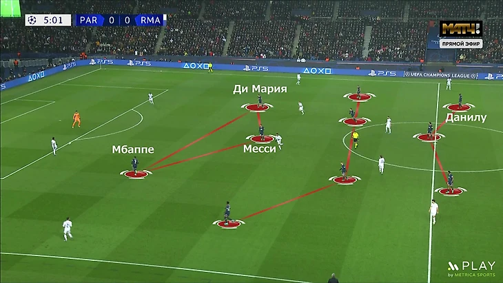«Париж» не давил на центральных защитников «Реала», но активно встречал в полузащите. То есть прессинг не был высоким, зато учитывал фактор Месси. Он вообще не двигался в таких эпизодах, а давление оказывали выдвигающиеся полузащитники (Верратти и Данилу):