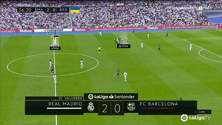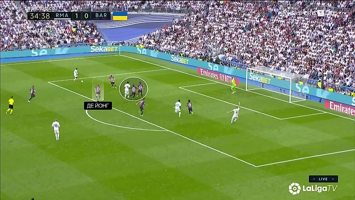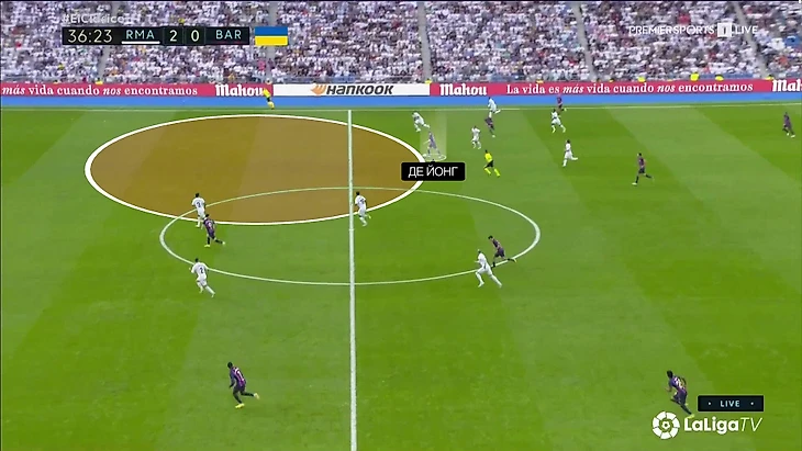 Де Йонг играет в стеночку с Рафиньей, на которого выдвигается (и оставляет зону) Алаба:
