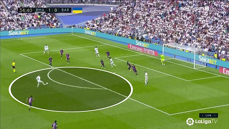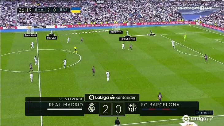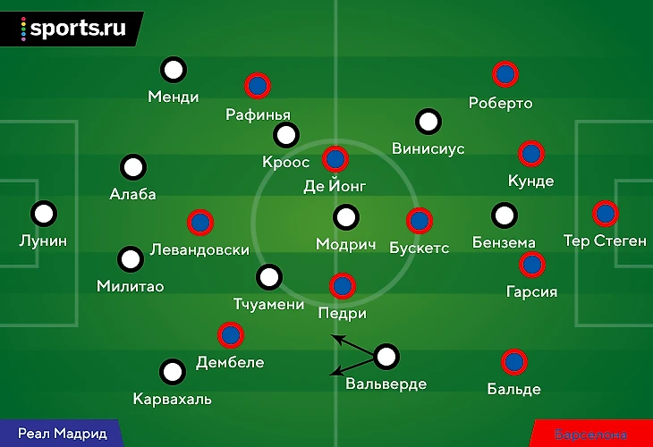 Частыми стали ситуации, когда у «Реала» в центре было по 5 игроков для комбинаций – Кроос, Тчуамени, Модрич, Менди и Вальверде. Они будто издевались, показывая «Барселоне», как делается то, на что команда Хави оказалась неспособна в первом тайме. Все классно двигались и взаимодействовали, константой была только зона Крооса, которая и сыграла ключевую роль в захвате контроля.