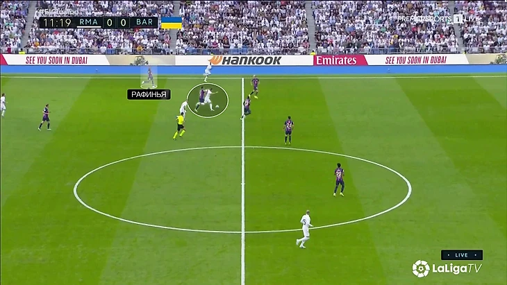 Это тот случай, когда прилетает не по адресу, а по принципу «бросился в глаза, а разбираться лень». Но мы тут собрались, именно чтобы разбираться. В первом голе после неудачной попытки контрпрессинга «Барсы» (первая проблема) Карвахаль направил мяч на фланг. Там сложилась такая ситуация: Рафинья против Крооса, Бускетс с Модричем (перекрывал его, пока партнеры выше пытались контрпрессинговать), Роберто с Винисиусом: