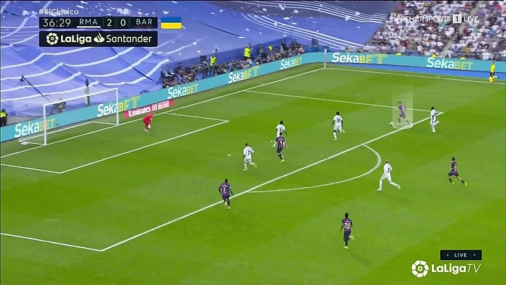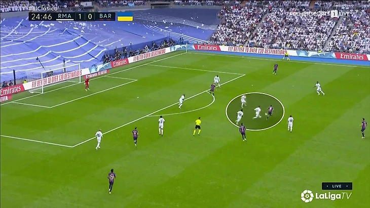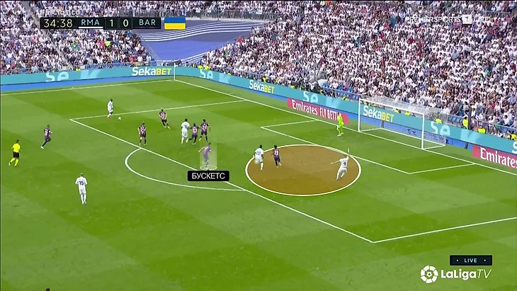 Забавным образом ставка «Барсы» на правый фланг в атаке только помогала. Они теряли мяч около этой зоны, «Реалу» было проще доставлять в любимом направлении. На стартовом отрезке именно «Мадрид» извлекал из этой зоны максимум, но по ходу тайма «Барса» стала острее атаковать (пускай и оставалась предсказуемой).