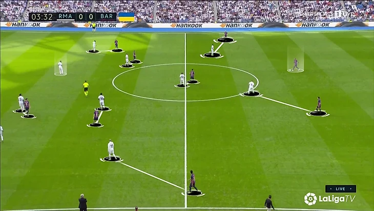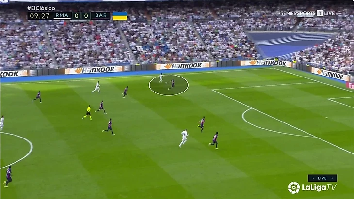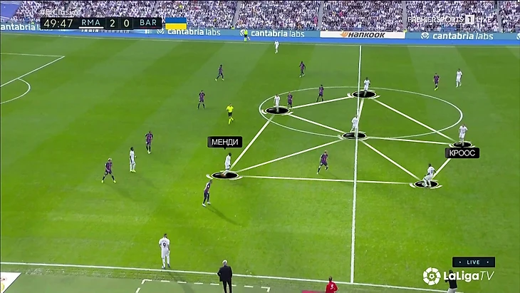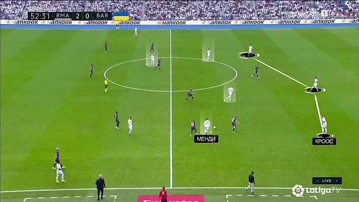 Тони Кроос в первой стадии на постоянной основе стал дополнительным центральным защитником (у «Реала» всегда был «+1» при розыгрышах – «Барсе» стало труднее прессинговать). Менди, чтобы не мешать Тони, открывался в центре полузащиты. Остальные игроки адаптировались:
