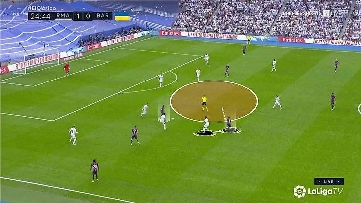 Ниже разберемся в деталях использования командами ключевой зоны, но сразу отметим, что у «Мадрида» тут было качественное преимущество – Винисиуса Жуниора сдерживал Серджи Роберто. Отчасти вынужденный ход. В прошлом класико Хави специально использовал Рональда Араухо справа под Винисиуса. Сейчас, если бы все были здоровы, против бразильца, вероятно, сыграл бы Кунде.