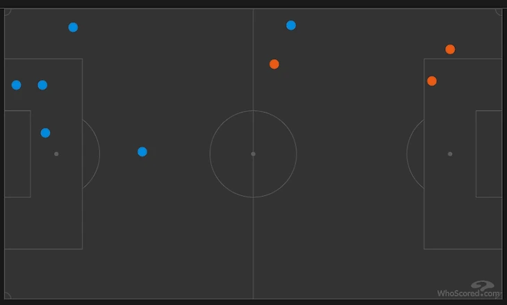 4. «Реал» создал себе задел в первом тайме. У этого отрезка был очень четкий рисунок и четкая ключевая зона. Правый фланг «Барселоны» (44% атак в первой половине) и левый «Реала» (все опасные контратаки). Эта тенденция очевидна даже из карты передач под удар в первом тайме – все на одной стороне поля: