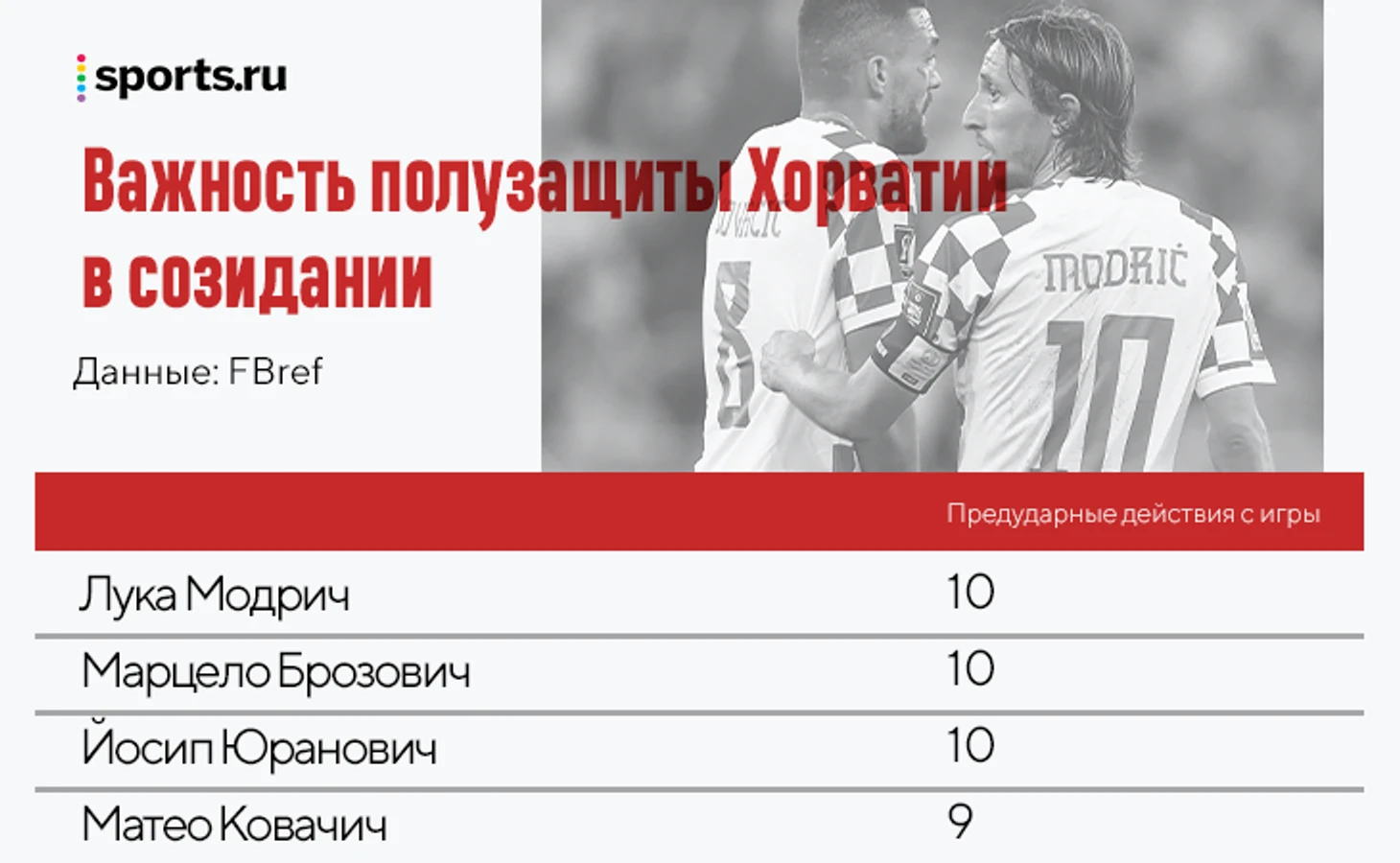 Они же активнее остальных участвуют в созидании. Хорватия в принципе создает не очень много моментов, но те, что создаются, всегда с их прямым участием. По предударным действиям с игры все трое – в топе. Между ними вклинился активный правый защитник Йосип Юранович: