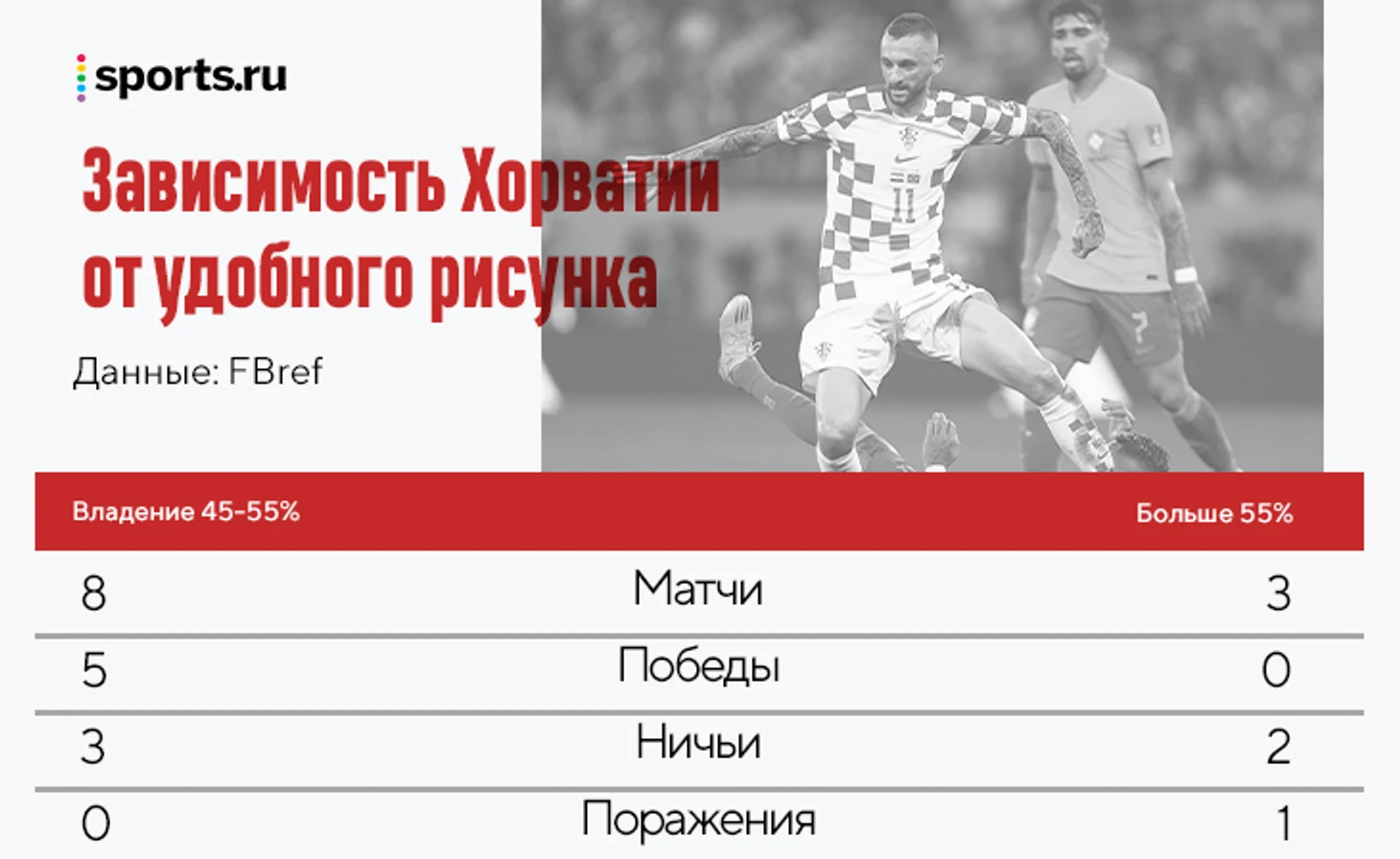 В играх Хорватии есть тенденция, прямо связанная с особенностями центра. Когда владение между 45% и 55% (ниже 45% не бывает), команда действует успешно. При владении больше 55% возникают проблемы. Так выглядит зависимость на основании матчей Лиги наций (там была сильная группа – Франция, Дания, Австрия) и этого ЧМ: