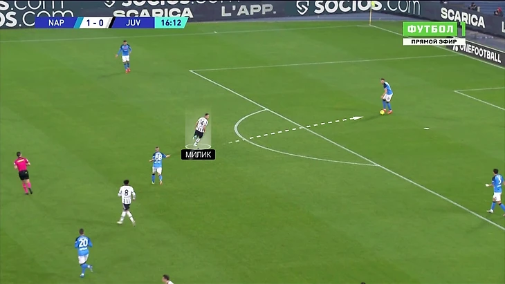Например, тут Милик начинает прессинг, хотя остальные игроки собирались возвращаться в схему: