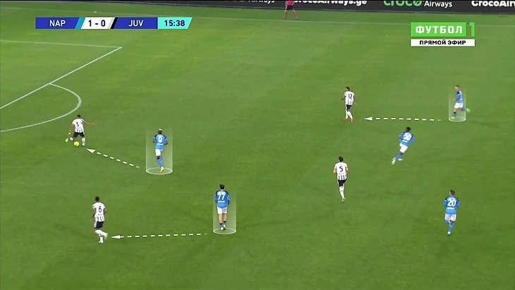 Самый частый сценарий при попытках разыгрывать коротко – «Наполи» давит на тройку защитников «Юве» и вынуждает сделать нечеткий пас на фланг, где накрывают.
