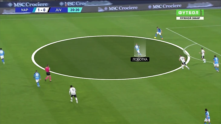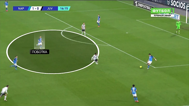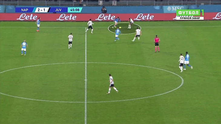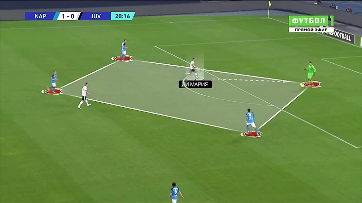 Аргентинца не остановило то, что у него нет нужной поддержки. У «Наполи» очень уверенный численный перевес. Ди Марию поддерживал только Милик – ситуация 4-в-2 (с учетом вратаря). Через пару передач получаем такую ситуацию – первая волна давления «Юве» отрезана, второй нет, Лоботка свободен: