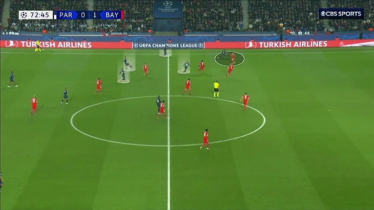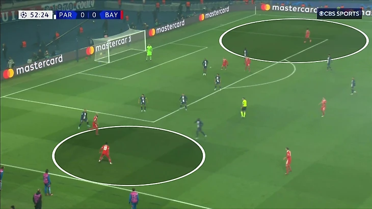 Ранее «ПСЖ» тушил такие эпизоды смещениями. Как минимум, одного из латералей накрывали работоспособные Заир-Эмери и Солер (сохраняя при этом цельность обороны). Для команды, которая так много обороняется против соперника уровня «Баварии» при активном участии всего восьми игроков, «ПСЖ» играл почти безупречно, но все-таки этой восьмерке было слишком трудно без поддержки. При такой нагрузке ошибка в смещениях была вероятной, но это была именно вызванная количеством проверок единичная ошибка, а не постоянные провалы.