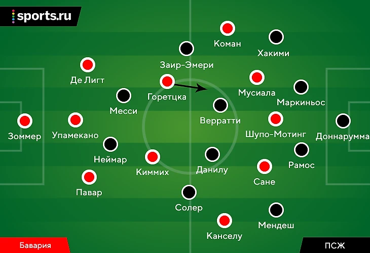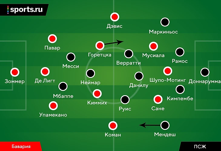 Особенно важной зоной стал левый фланг «ПСЖ»/правый «Баварии». У гостей при обороне тут отрабатывал непрофильный Коман (после его замены такой же непрофильный Гнабри). У «ПСЖ», наоборот, были атакующий латераль Мендеш (против Маркиньоса на другом фланге) и Мбаппе, который тяготеет именно к этой стороне.