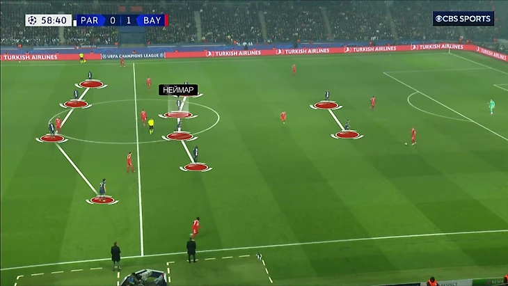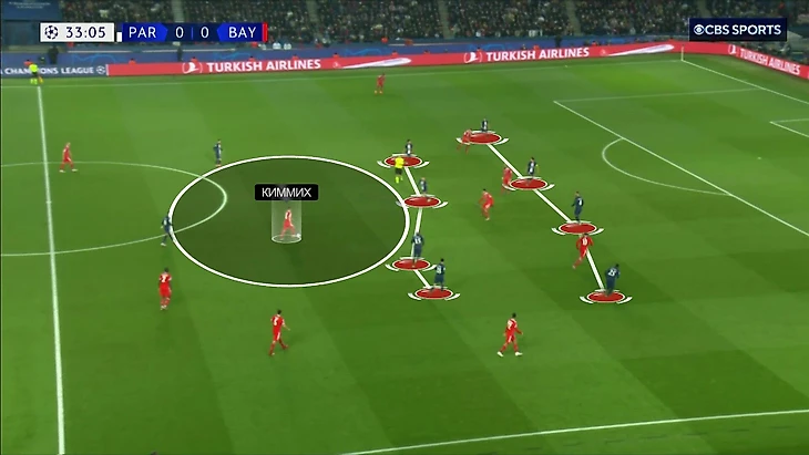 Но прямо образцовой их игру без мяча в среднем и низком блоке назвать не получится. Например, хозяева давали слишком много свободы Киммиху. Изначально казалось, что у «ПСЖ» 4-4-1-1, в которых Неймар будет играть по опорнику «Баварии». Бразилец здорово проделал похожую работу с Паредесом в матче против «Ювентуса» в группе: