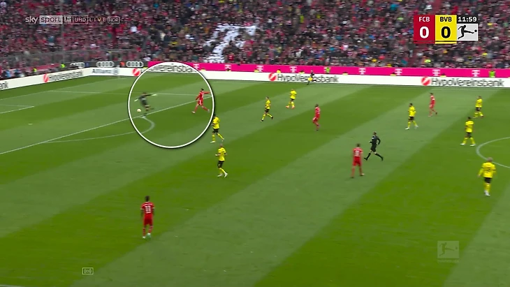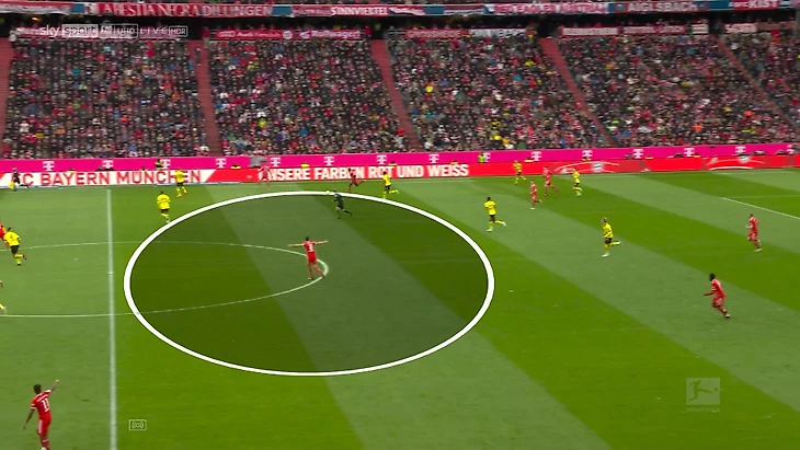 Отдельного упоминания заслуживает Леон Горетцка – его рывки сильно помогали «Баварии» в такие моменты. По сути он выводил команду из-под прессинга нетрадиционным образом – не спускался сам, чтобы сохранить мяч через тонкую технику, а делал рывки и оголял дыры, чем создавал легкий вариант выхода партнерам.