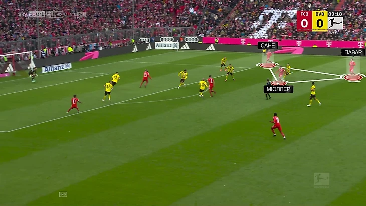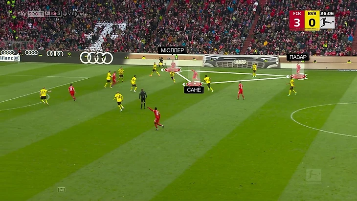 Всегда кто-то заполнял зону, но каждый имел право заниматься и другой работой. В случае Сане это проходы со смещением в центр, в случае Мюллера – чтение и использование пространства в чужой опорной, в случае Павара – контроль чужих контратак. Роль правого флангового они брали на себя поочередно.