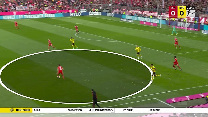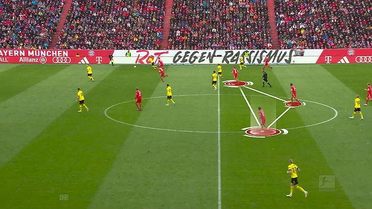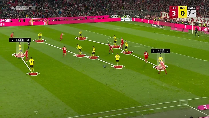 При этом на другой части поля «Бавария» достигала максимального эффекта в прессинге. Однофланговый прессинг выглядел примерно так. Обратите внимание на позицию Кингсли Комана – он ближе к Зюле и Беллингему (может замыкать давление по ним), чем к собственному флангу: