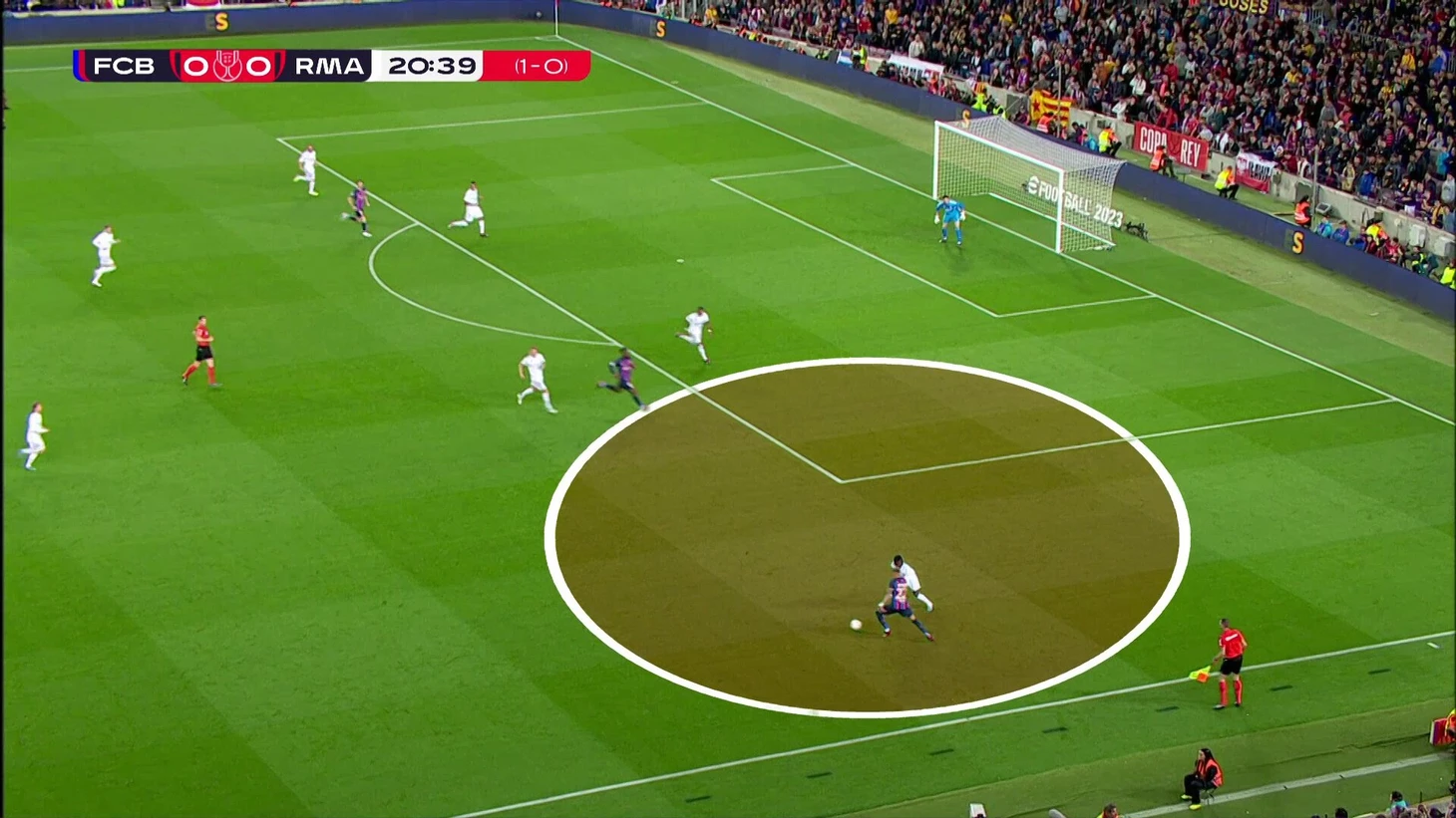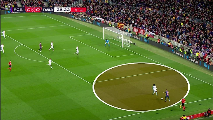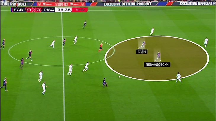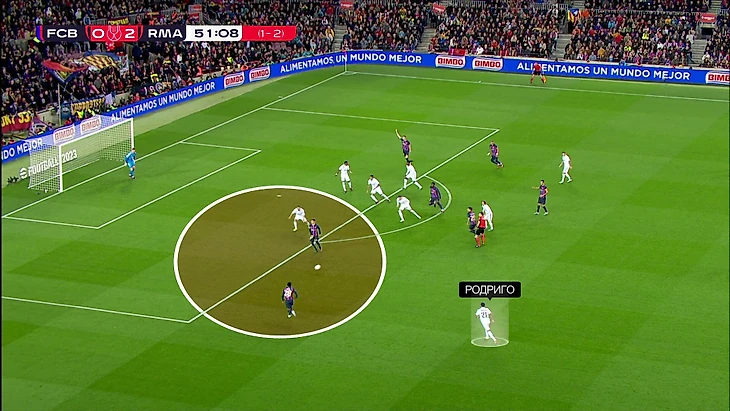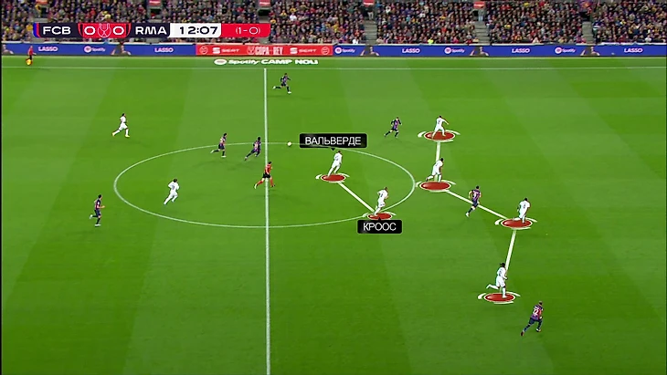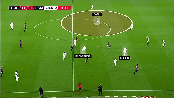 Здесь Вальверде и Кроос отстали от эпизода, опорная свободная, Гави мог бы притормозить и использовать это – вокруг него огромная свободная зона (была отличная возможность подготовить пас).