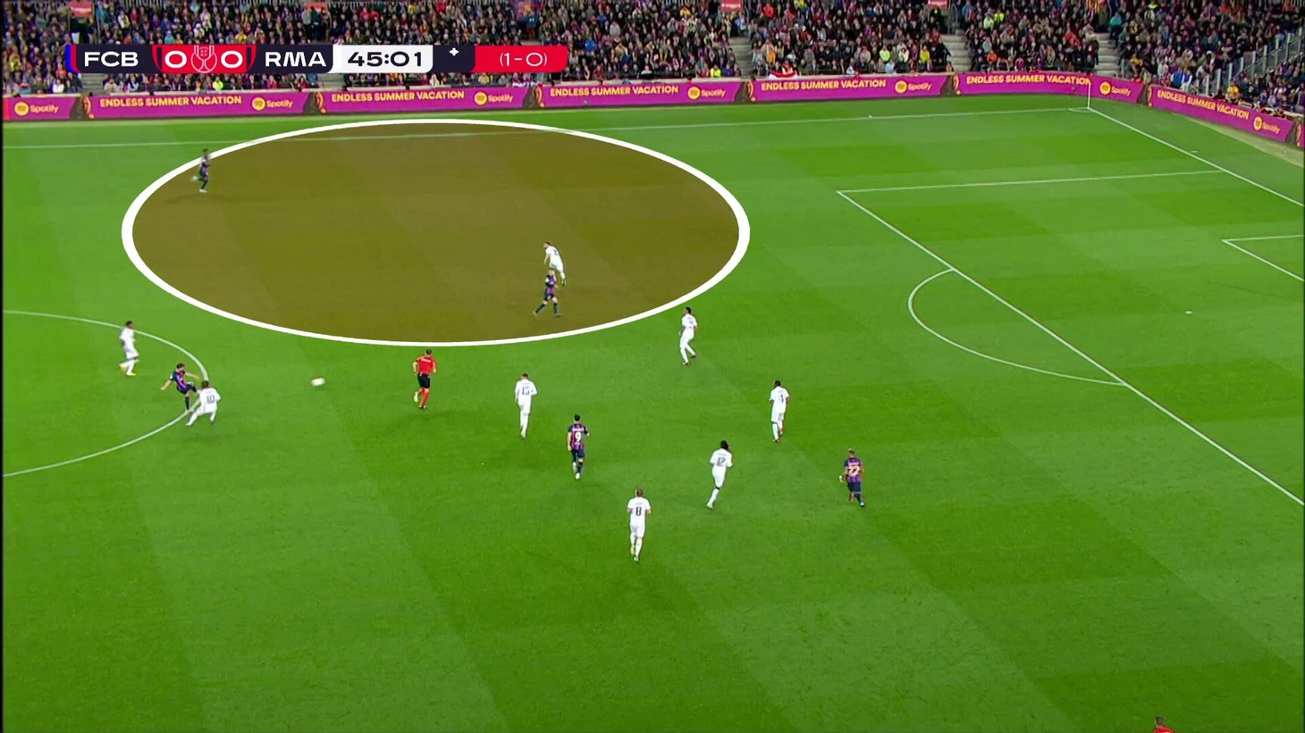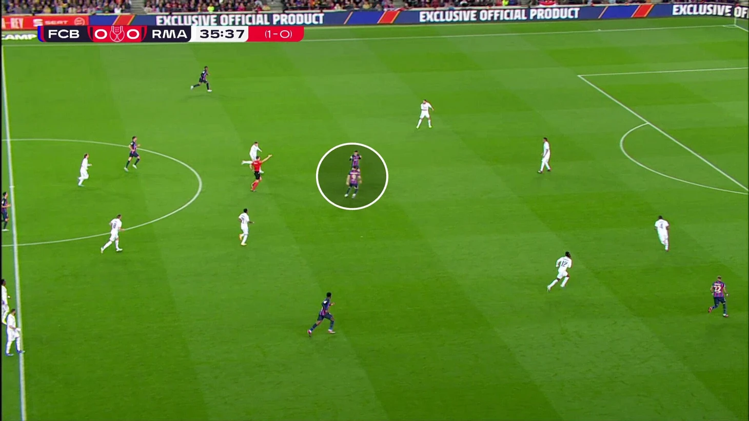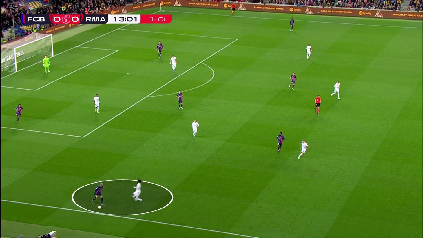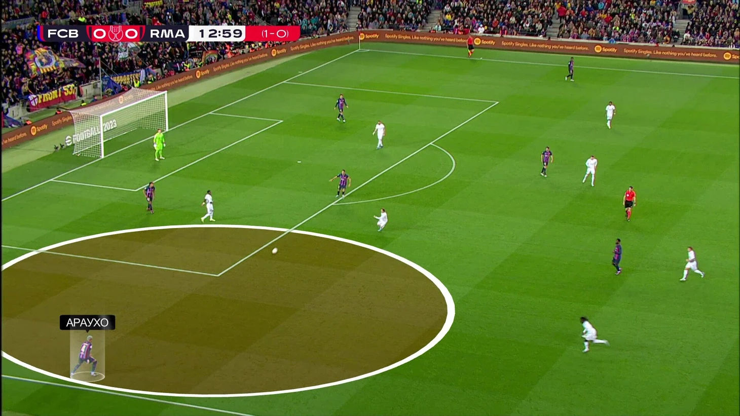 В начальной стадии давления «Реал» занимал очень смелые позиции, при этом насыщал только правую сторону поля. Свободным игроком у «Барсы» оставался Араухо: