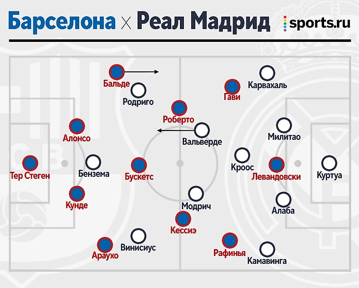 Акценты были расставлены так, чтобы «Мадрид» извлек из размена больше, чем соперник. Совсем невзрачных игроков у «Барсы» на мяче нет, но, если выбирать, именно Араухо выглядит логичным в качестве слабого звена при владении. Хозяева периодически пытались использовать его свободу для выхода в атаку: