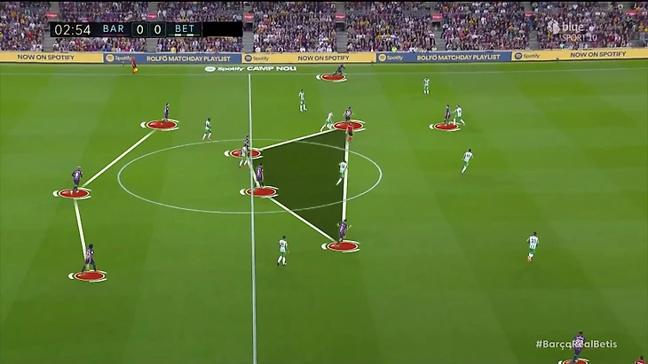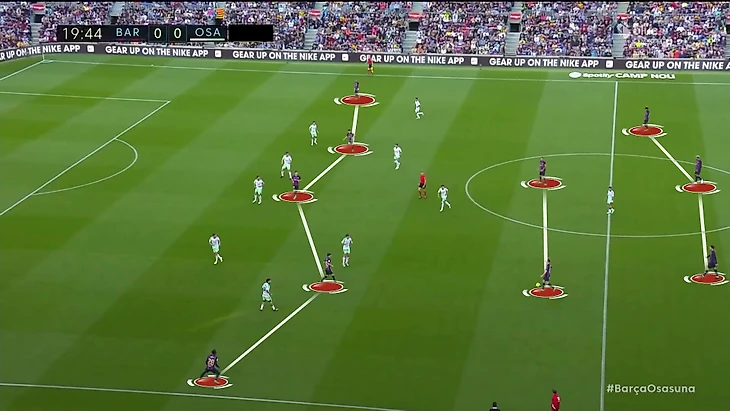 В контрпрессинге «Барса» всегда идет в давление. Фишка тут в расположении игроков во время потери. Команда постоянно держит структуру, которая позволяет хорошо реагировать. Как правило, это вариация построения 3-2-4-1 (3-2-5):
