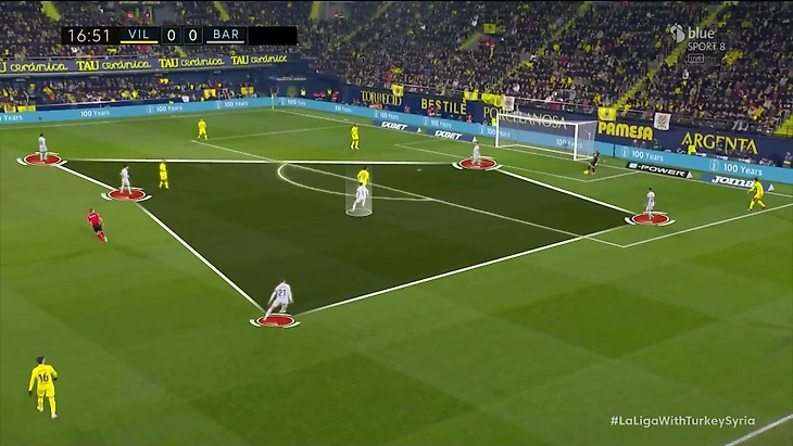 В случае паса на фланг включаются механизмы чтения эпизода – либо накрывает ближайший игрок из шестерки, либо выдвигается крайний защитник. Иногда Хави адаптировал структуру так, чтобы крайний защитник был в заведомо более высокой позиции – и накрывал быстрее. Такие детали зависят от розыгрышей соперника. В этой стадии «Барса» всегда качественно готовилась.